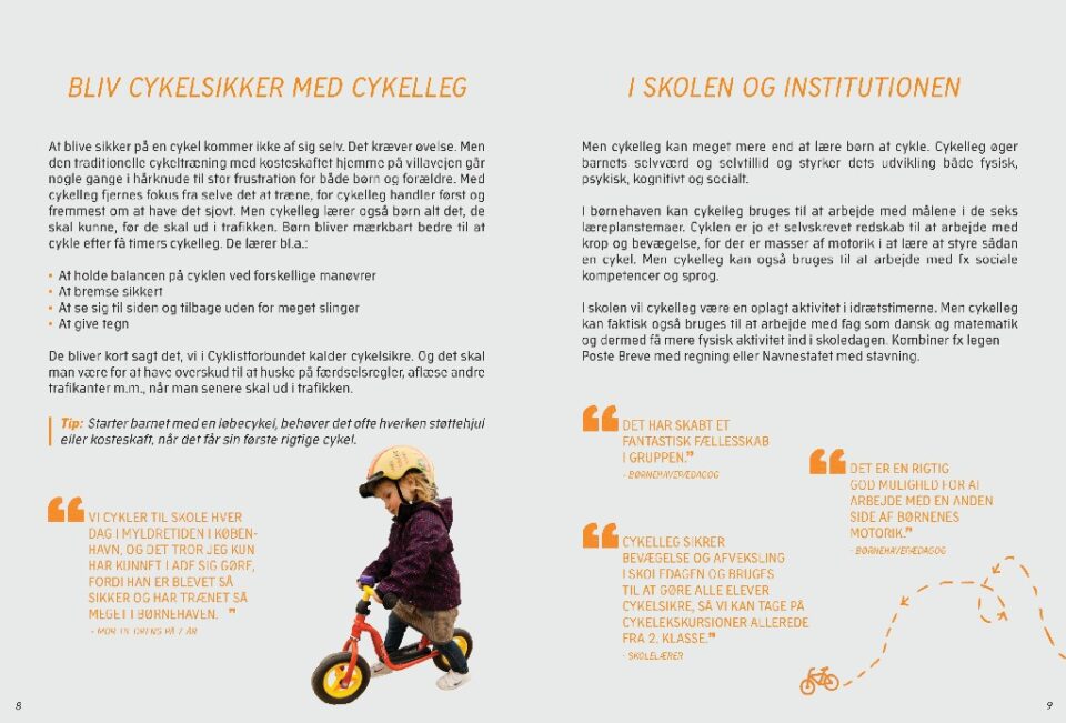北欧デンマークでも同様の教育思想が根づいています。 サイクリスト連盟(Cyklistforbundet)が発行した教材 『20 Cykellege – 20通りの自転車ゲーム』には、 子どもがプッキーのランバイクを使って練習する写真が掲載されています。