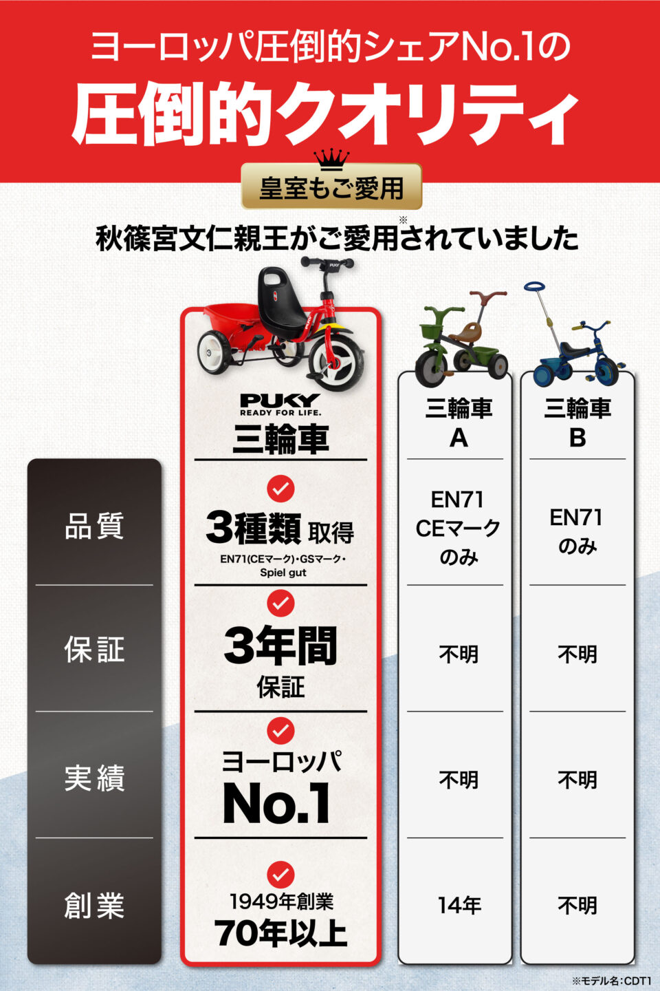 世界で数々の国際賞を受賞し、皇室でもご愛用いただいている、信頼の三輪車です。