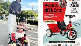 それでいて、1~2歳で、まだ三輪車に乗れないお子さんのためには、ハンドルロック、フリーホイール、押し棒付きでベビーカーのように乗せられる「ベビーカー仕様」対応。見た目は三輪車に乗っているようにかっこよく、実際には大人に押してもらって楽ちんに乗れるのです。